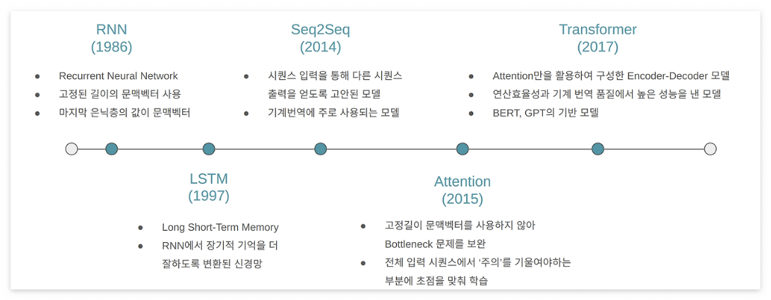 * RNN 계열의 Model들 : 고정된 크기의 context vector 사용 / 단어의 순서를 학습