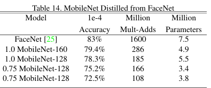 MobileNet은 지식 증류(Knowledge Distillation) 방식과 결합해 대규모 얼굴 속성 분류기도 경량화할 수 있다. 원래 사용하던 모델은 75M 파라미터, 1600M 연산량을 가진 매우 큰 구조였다.