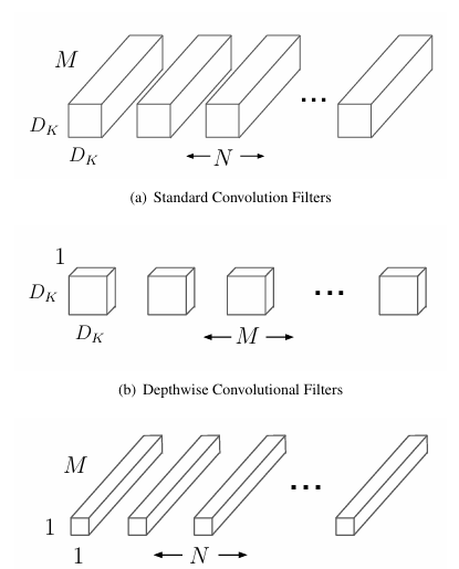 (여기서 Dk는 커널 크기, M은 입력 채널 수, N은 출력 채널 수, DF는 feature map의 공간 크기) - depthwise separable convolution의 연산량: