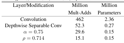 위 테이블에서 보듯, depthwise separable convolution만 적용해도 연산량은 약 9배 줄어들고, width 및 resolution multiplier를 적용하면서 추가적인 경량화를 이끌 수 있다. resolution multiplier는 연산량을 resolution² 비율로 감소시키며, 파라미터 수에는 영향을 주지 않는다.