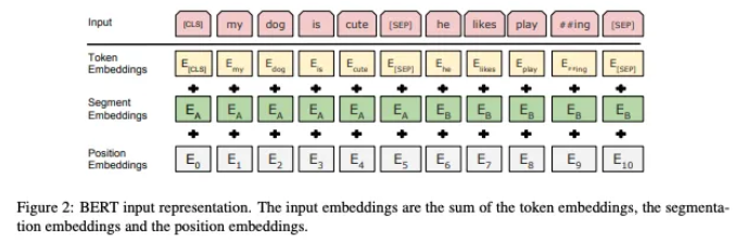 - 최종 입력 표현 = 토큰 임베딩 + 세그먼트 임베딩 + 위치 임베딩의 합