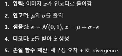 이 흐름 덕분에 VAE는 모든 과정이 학습 가능한 형태로 정리되고, 확률적 생성이 가능해진다.