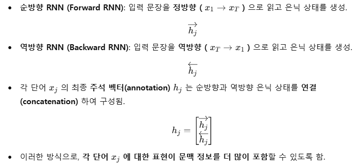 - 디코더가 특정 시점 t에서 단어 를 생성할 때, 입력 문장의 모든 단어를 참고함.