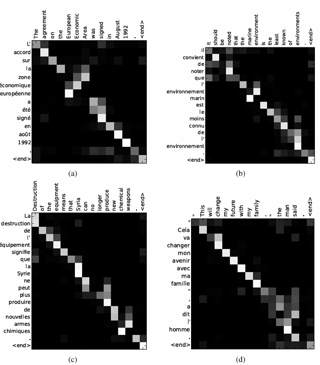 - Fig. 3을 보면, 영어와 프랑스어 단어 정렬이 대체로 대각선 방향으로 일어남.