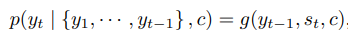- 컨텍스트 벡터 ccc 와 이전에 예측된 단어들 {y1,...,yt−1} 을 사용하여 다음 단어를 예측하는 확률을 학습함.