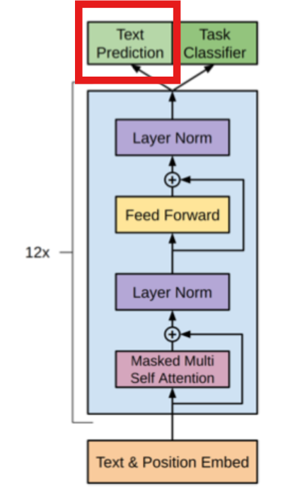 기존 decoder 부분에서 encoder layer가 없기 때문에 encoder-decoder attention을 제외하였고, 임베딩(We)후 potision embedding matrix( Wp )를 더하고, layer의 갯수만큼 decoder block을 통과하고 position-wise layer( WeT )를 거쳐 softmax로 확률값을 구함.